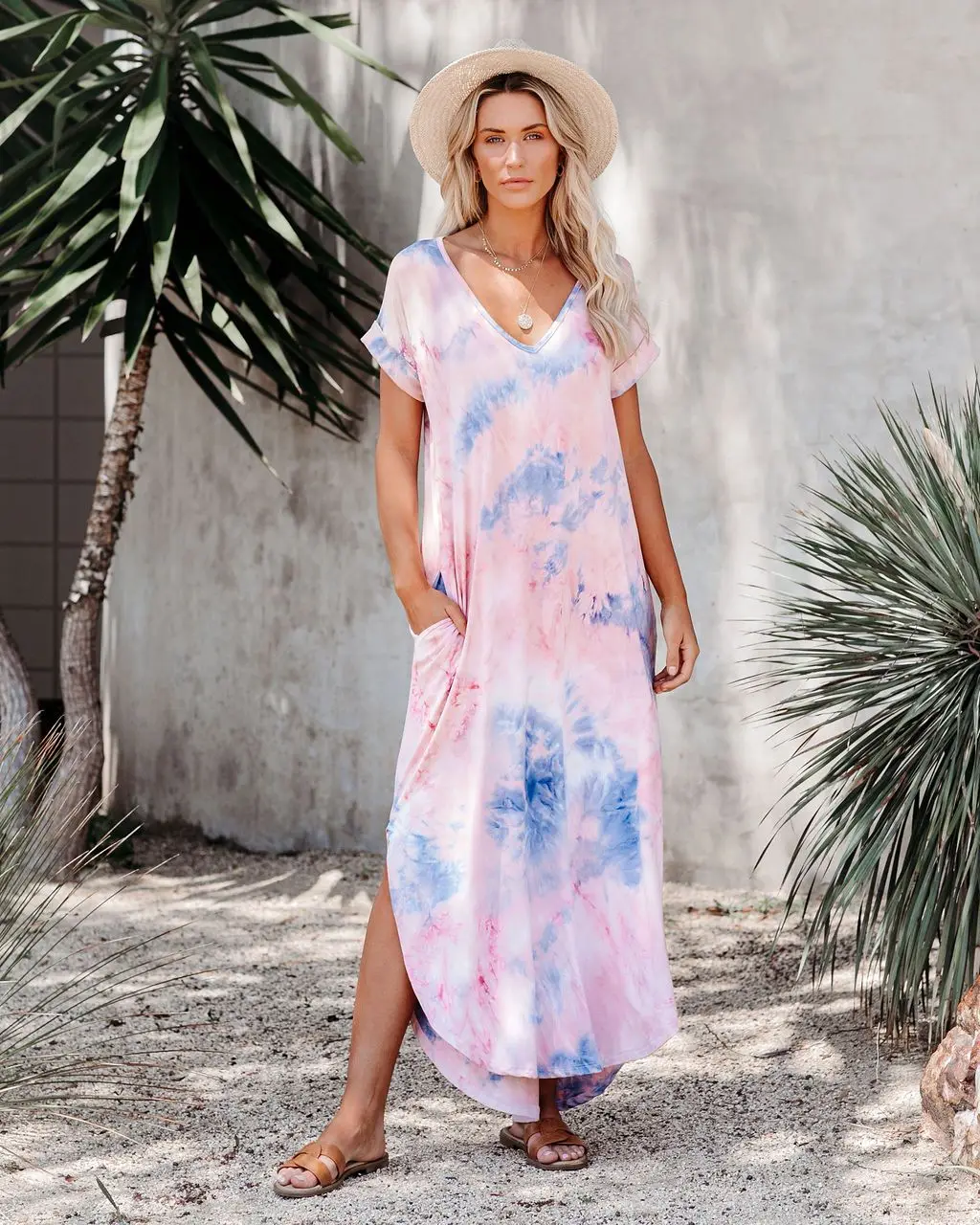 Home>Women's Dresses>Vacation Dresses>2021 New Arrival Women Print Short Sleeve Dress Loose Split Long Dresses Beach Style Summer Lady Sundress Clothing