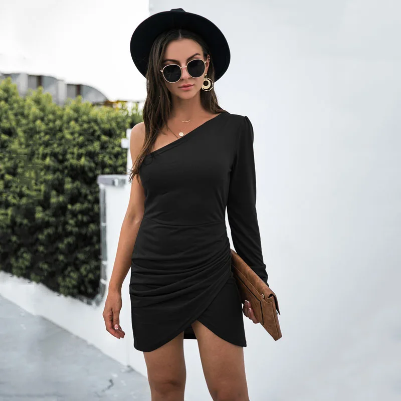 - Product Name: Black Oblique Off One Shoulder Long Sleeve Women Dresses Fall 2021 New Irregular Slim Ruched Bodycon Pack Hips Short Mini Dress