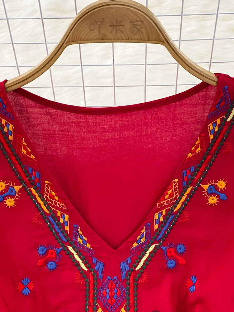 - Product Name: Bohemian Retro Ethnic Embroidery V-neck Waist A-line Seaside Holiday Swing Long Vestidos Dress