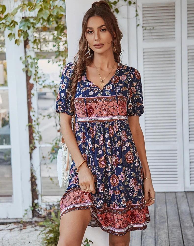 - Product Name: Boho Floral Print Loose Casual High Waist Ruffles Sleeve Mini Dress