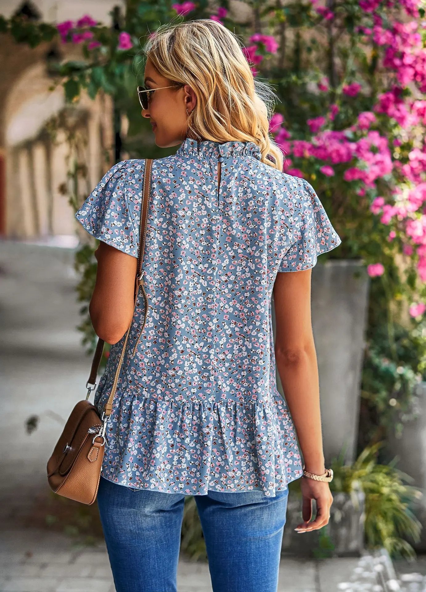 - Product Name: Boho Womens Half High Collar Short Sleeve Floral Print Casual Ruffles Loose Blouse