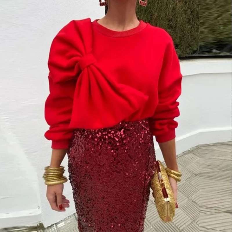 Bowknot Design Fashionable Sweatshirt Women New Spring Elegant O-neck Top Pullover Autumn Long Sleeve Solid Office Blouse Shirts