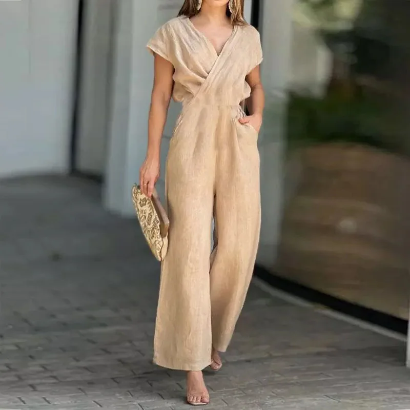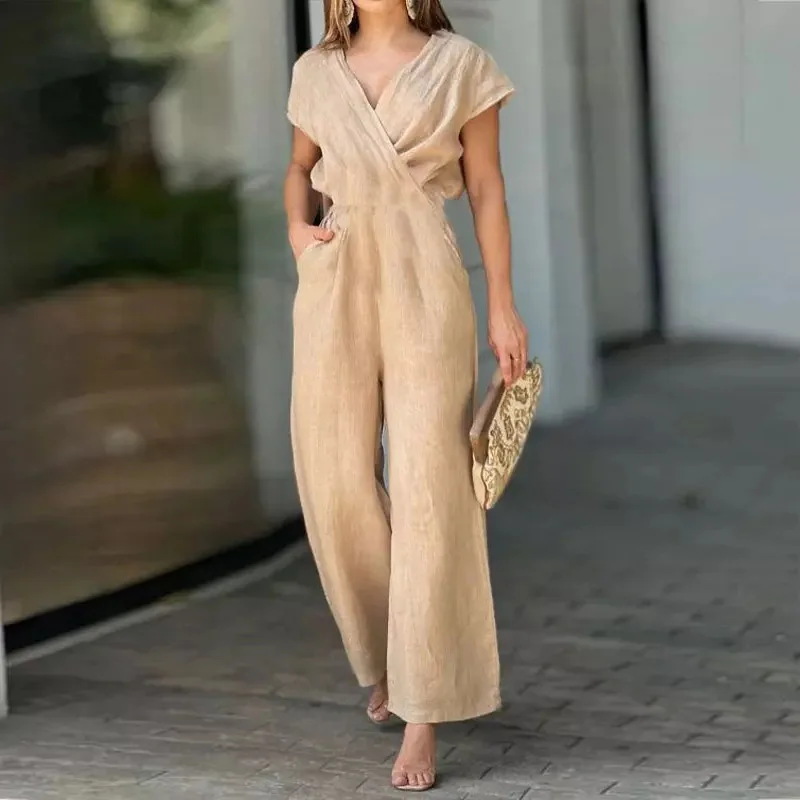 Elegant Casual Short Sleeve Loose V Neck High Waist Wide Leg Jumpsuit
