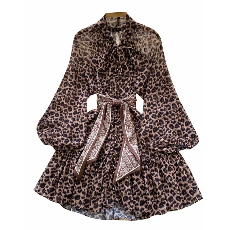 - Product Name: Fashionable Scarves Straps Waistband Lantern Sleeves Leopard Print Mesh A-line Mini Dresses