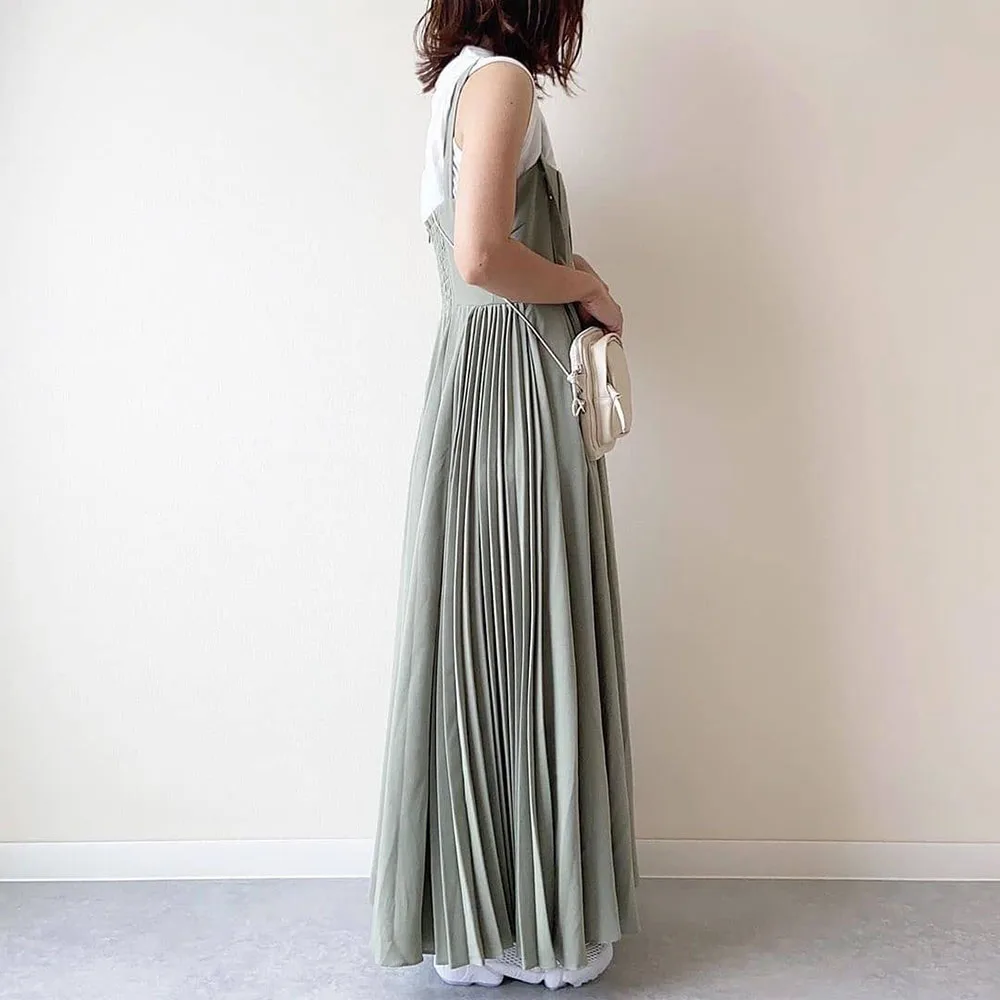 Japanese Women Long Dress Waist Pleated Maxi Dresses Suspenders Solid Color Wild Suspender Female Sling Dress Pleated Patchwork