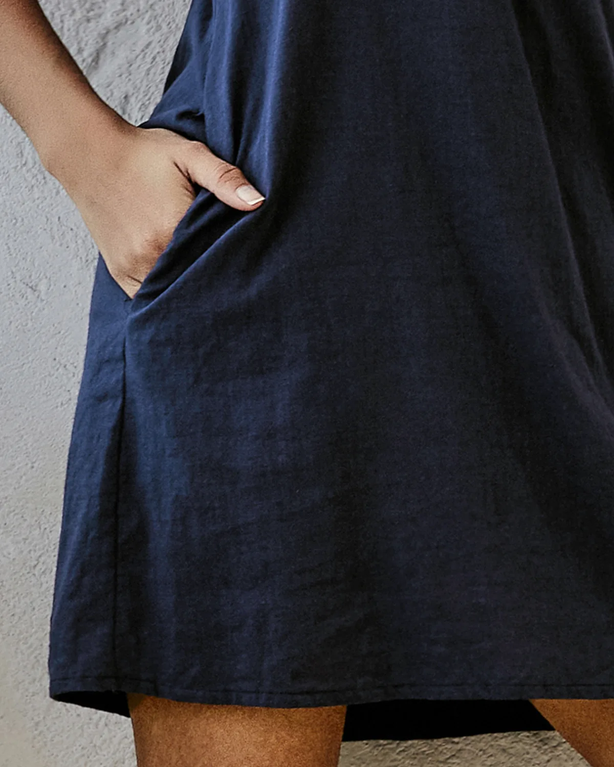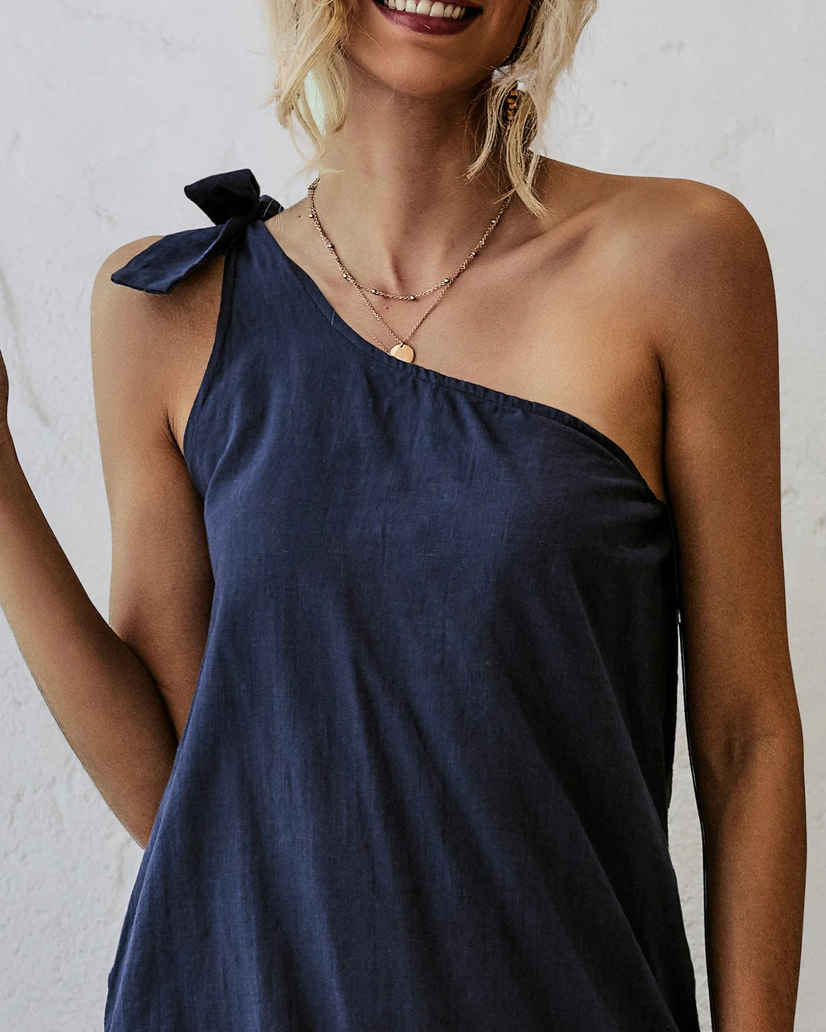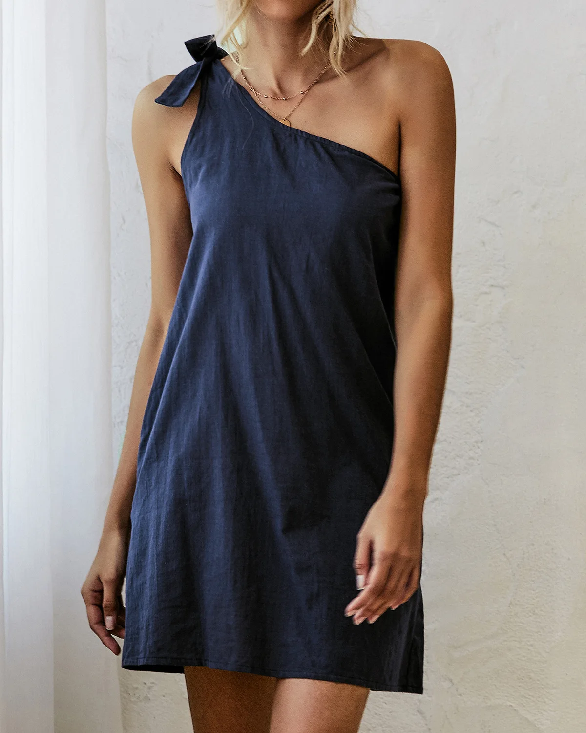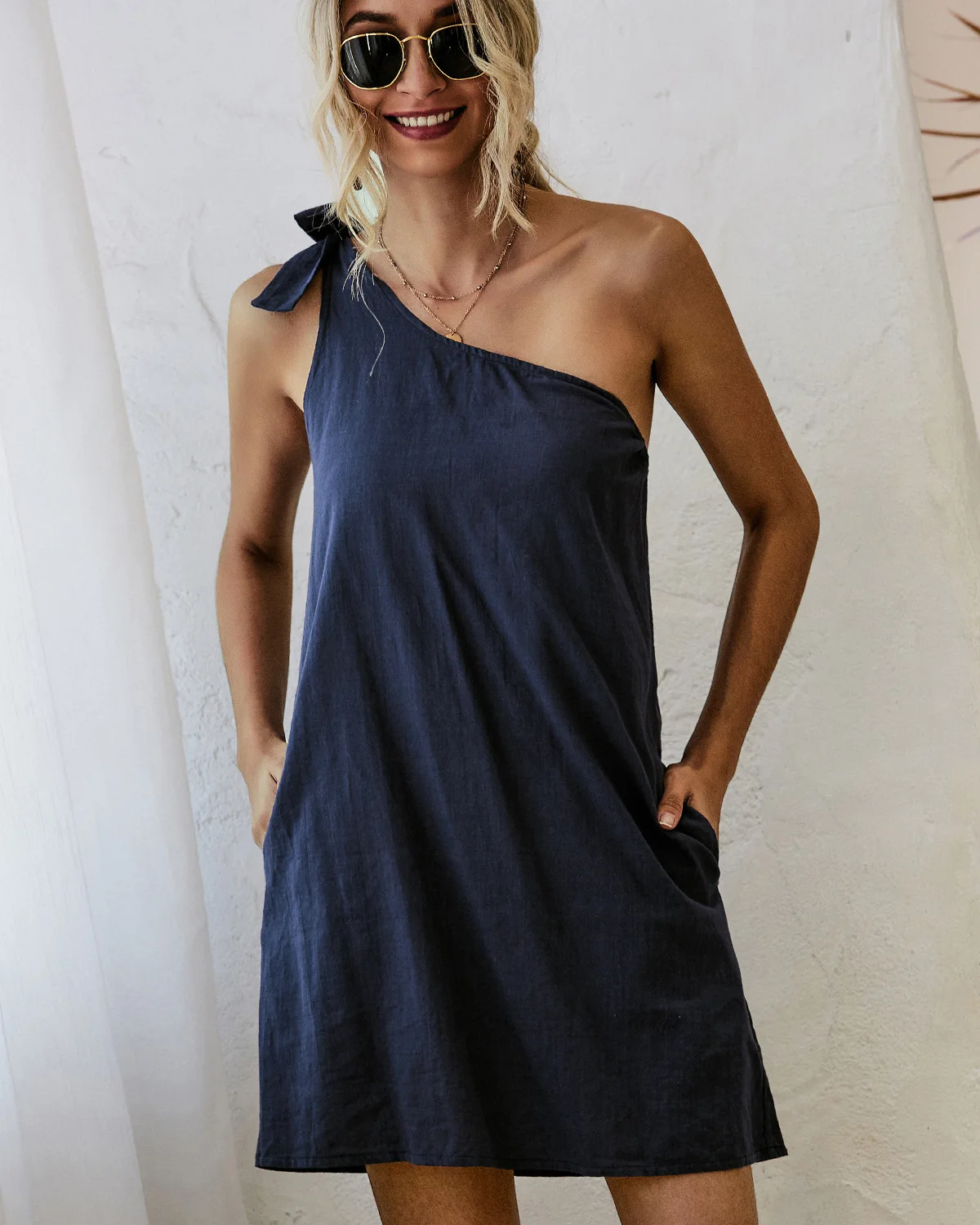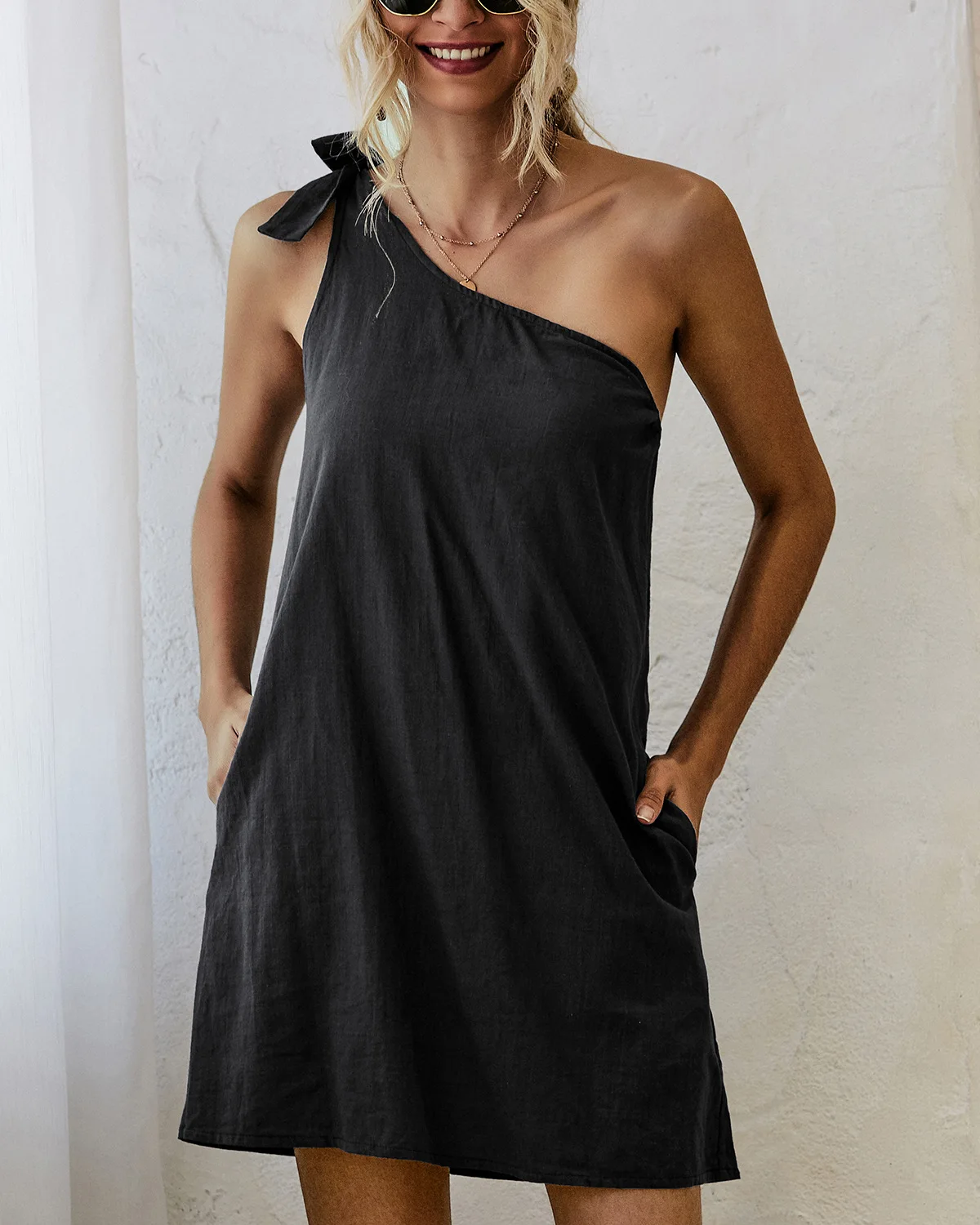 New Style Women'S Slanted Shoulder Slimming Strappy Sexy Dress Summer Women'S Solid Color Casual Mid Length Beach Dress