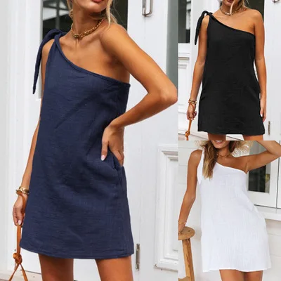 - Product Name: New Style Women'S Slanted Shoulder Slimming Strappy Sexy Dress Summer Women'S Solid Color Casual Mid Length Beach Dress