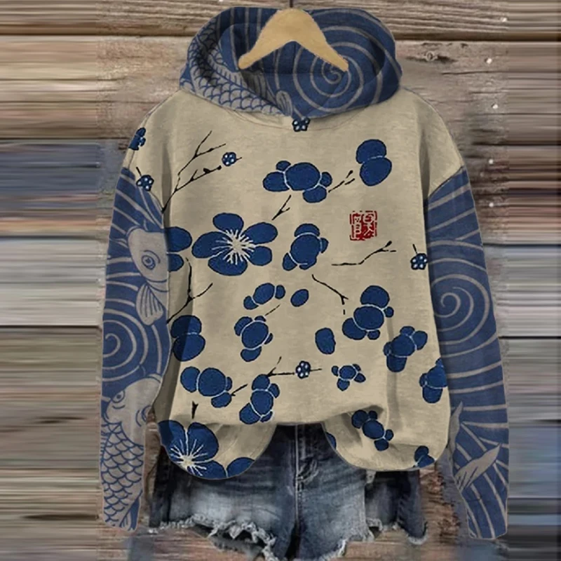 O Neck Sweatshirt Women Long Sleeve Print Plum Blossom Casual Loose Pullover Top