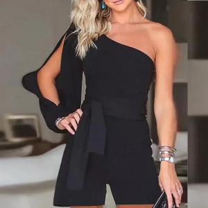 - Product Name: Office One Shoulder Solid Color Elegant Fashion Tie Long Sleeve Rompers