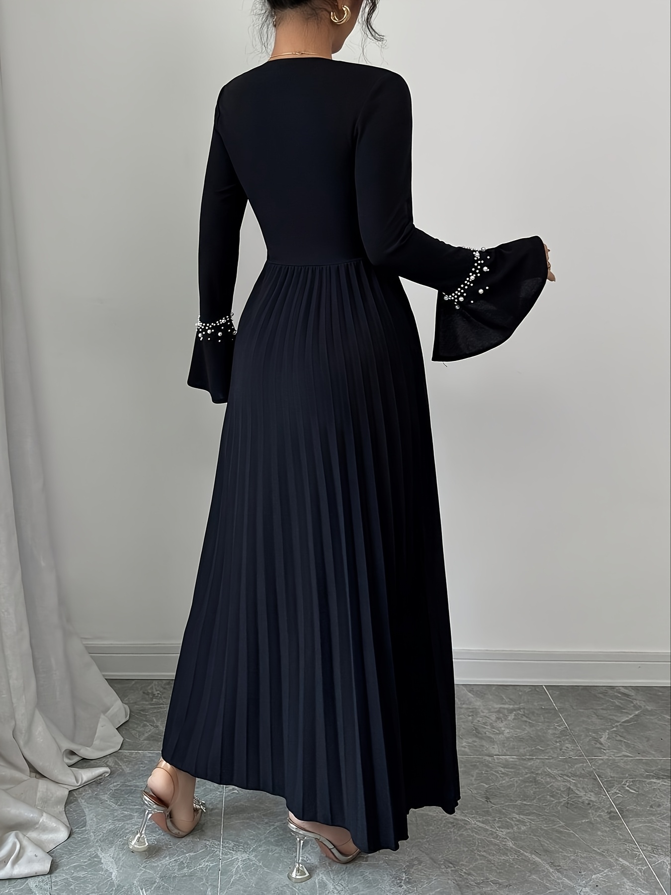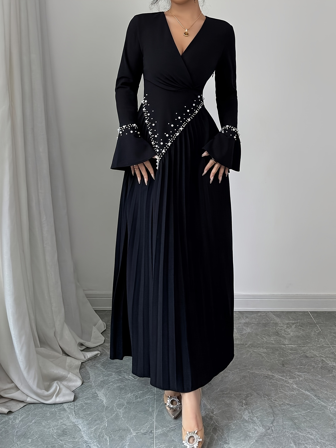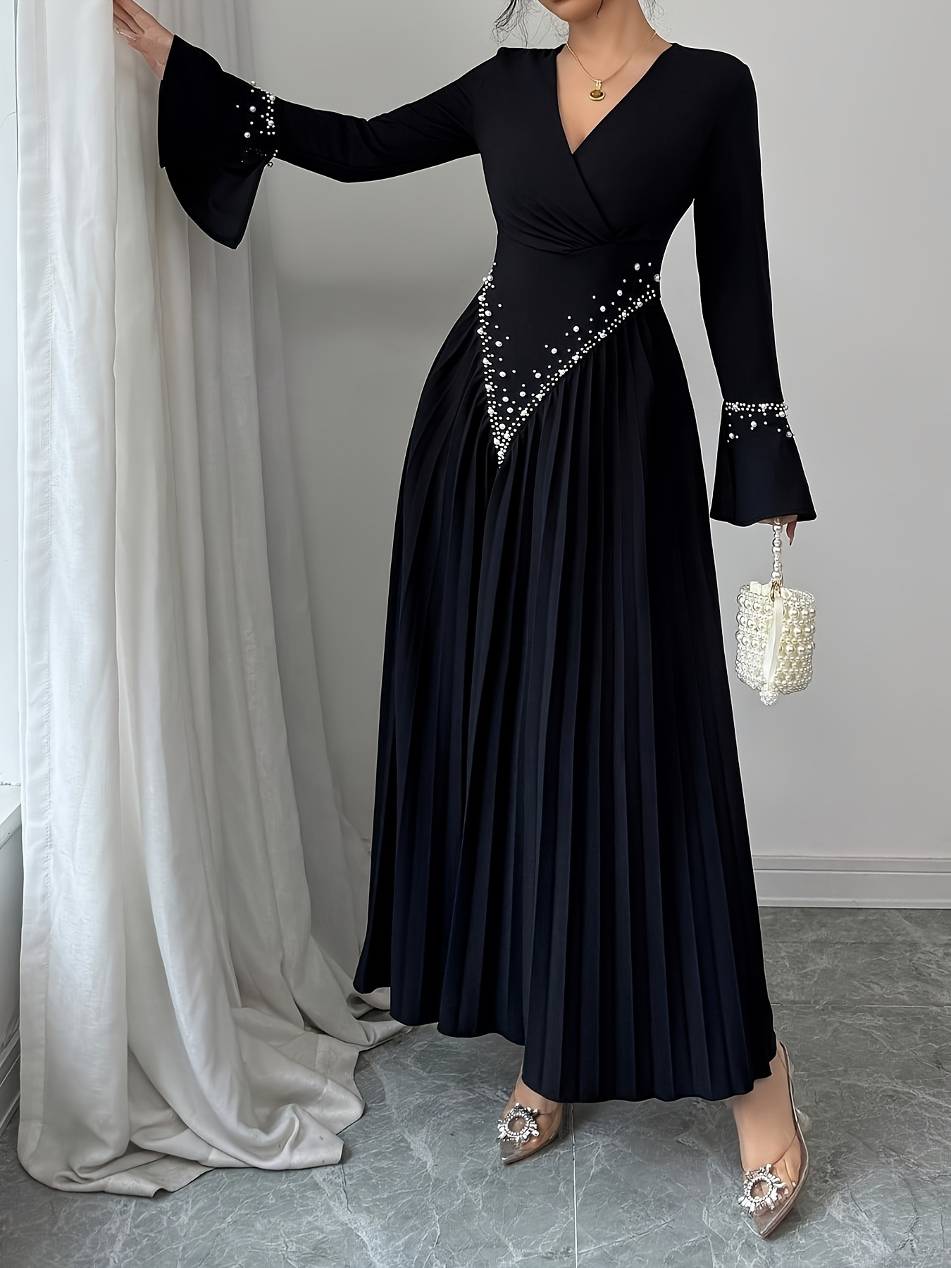 - Product Name: Ruched Pearl-Embellished Long Sleeve V-Neck Fitted A-Line Elegant Romantic Date Dress for Women