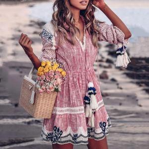 Home>Women's Dresses>Mini Dresses>Sweet V Neck Printed Colour Tassel Lace Splicing Casual Mini Dress