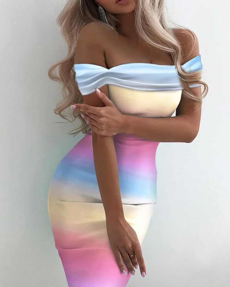 Trendy Gradient Rainbow Off-Shoulder Slant Neck Sheath Party Mini Bodycon Dress