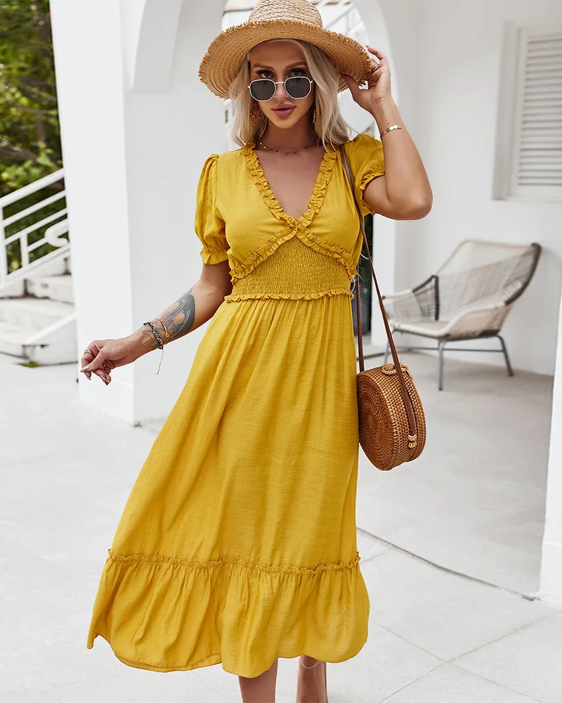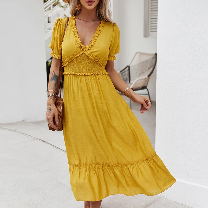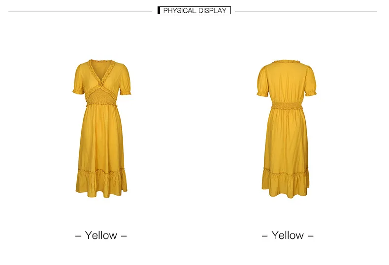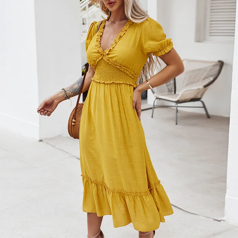 Brand Name:streetally,Sleeve Style:Regular,Fabric Type:Chiffon,Pattern Type:Solid,Silhouette:A-LINE,Neckline:V-Neck,Decoration:RUFFLES,Style:Casual,Dresses Length:Mid-Calf,