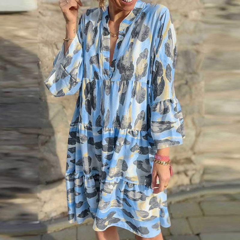 - Product Name: Women Casual Loose Home Print Flare Sleeve Shirt Dress 2021 Fall Women Fashion Sexy V-neck Beach Dress