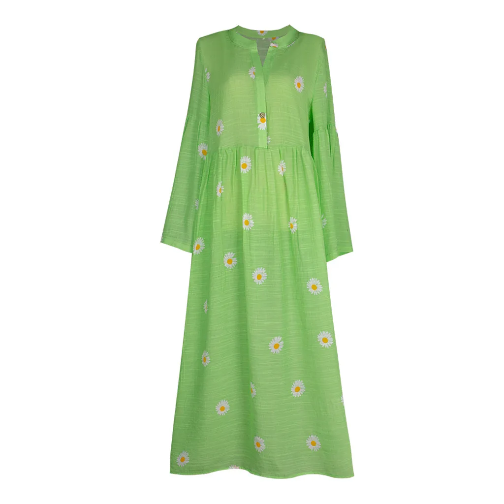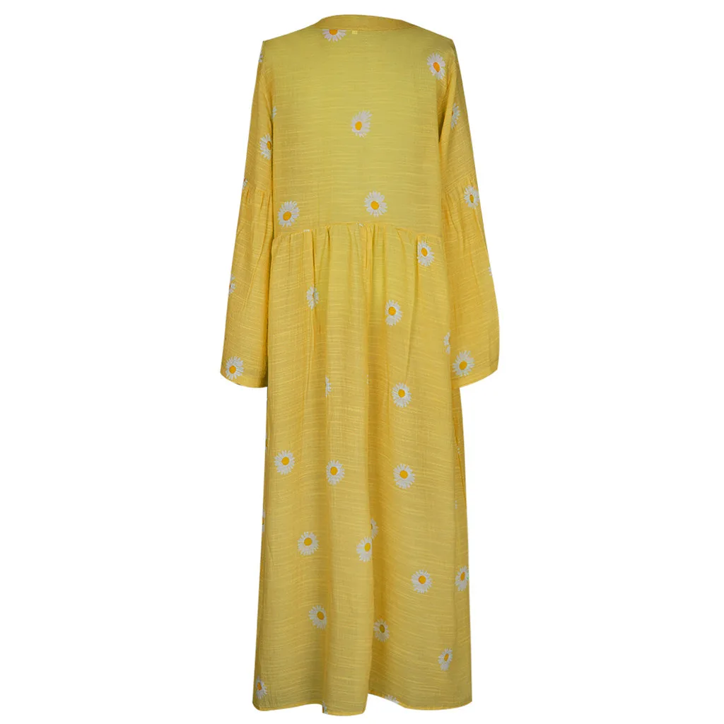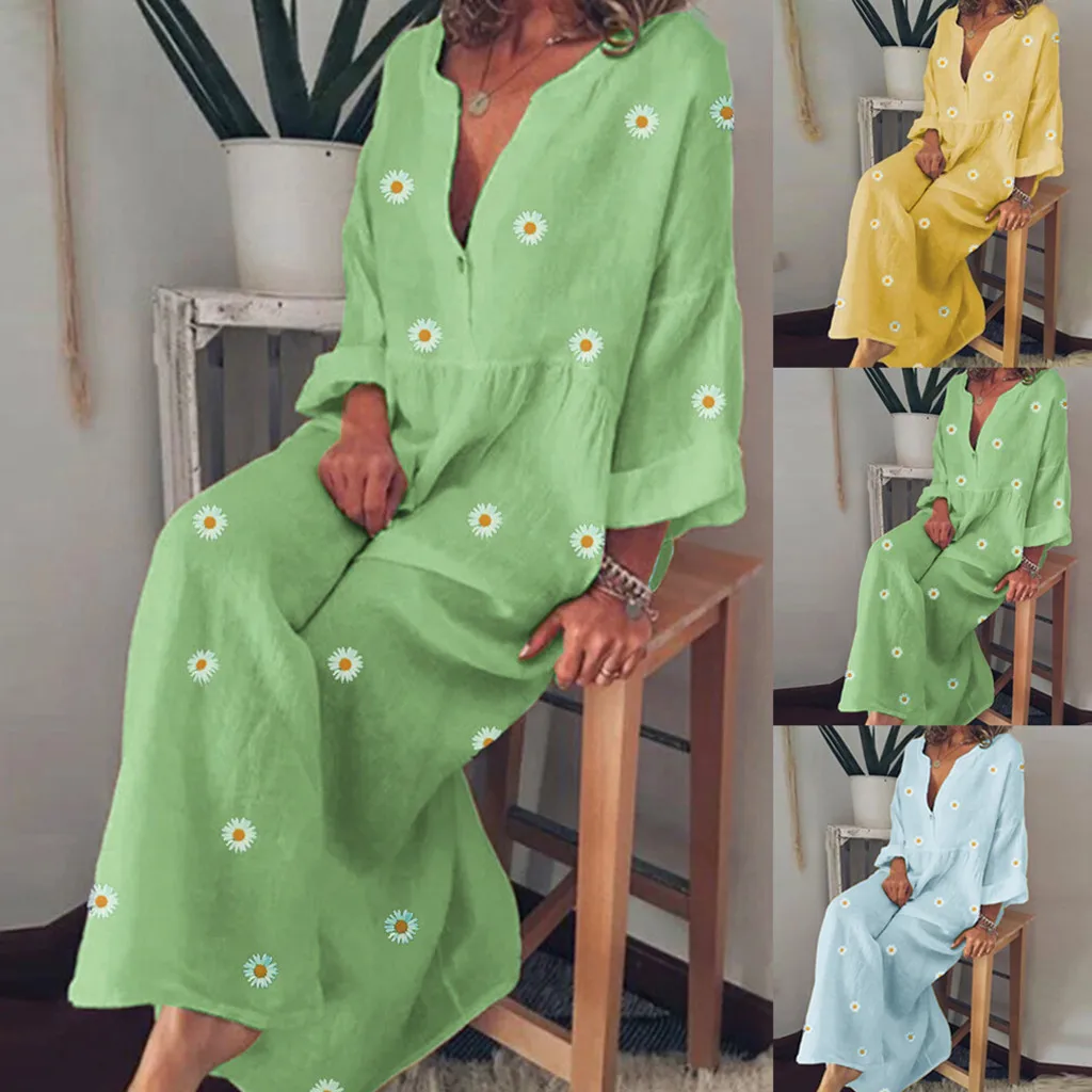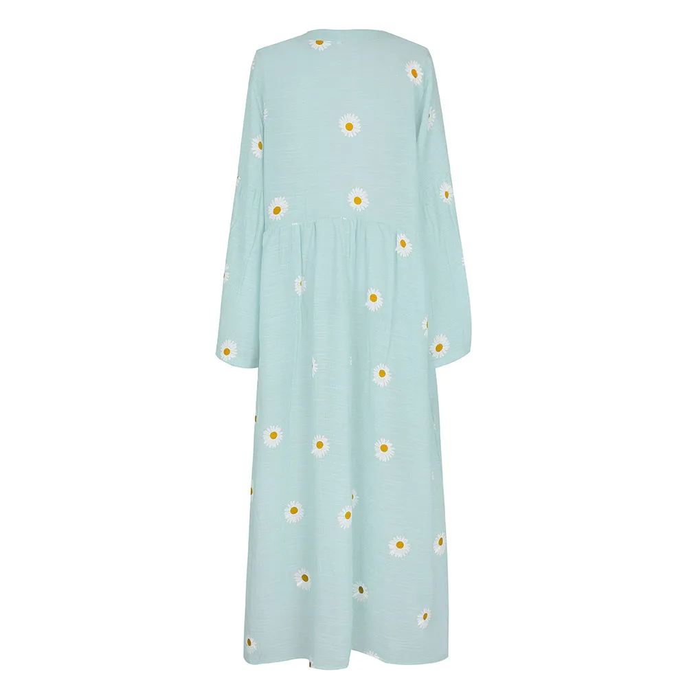 Women Dress Ladies Summer Fashion Casual Daisy Floral Print Long Sleeves Cotton V-Neck Loose Maxi Dress Plus Size