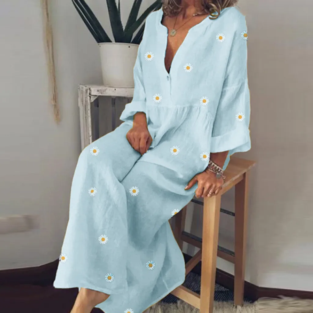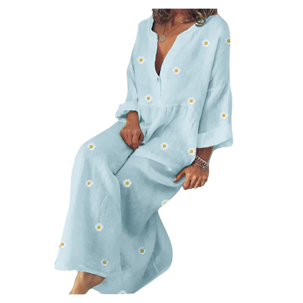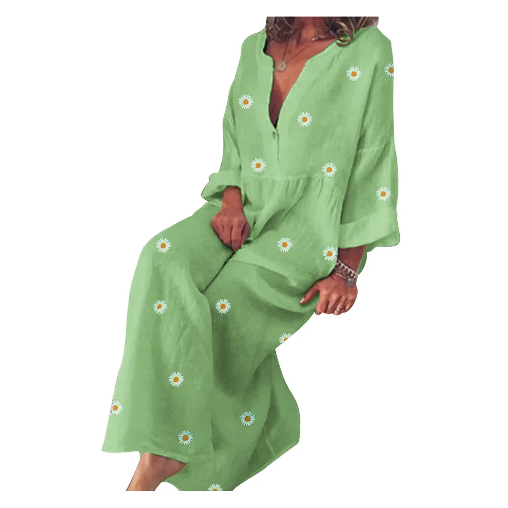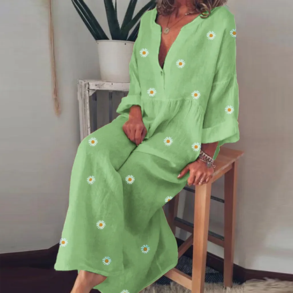 Women Dress Ladies Summer Fashion Casual Daisy Floral Print Long Sleeves Cotton V-Neck Loose Maxi Dress Plus Size