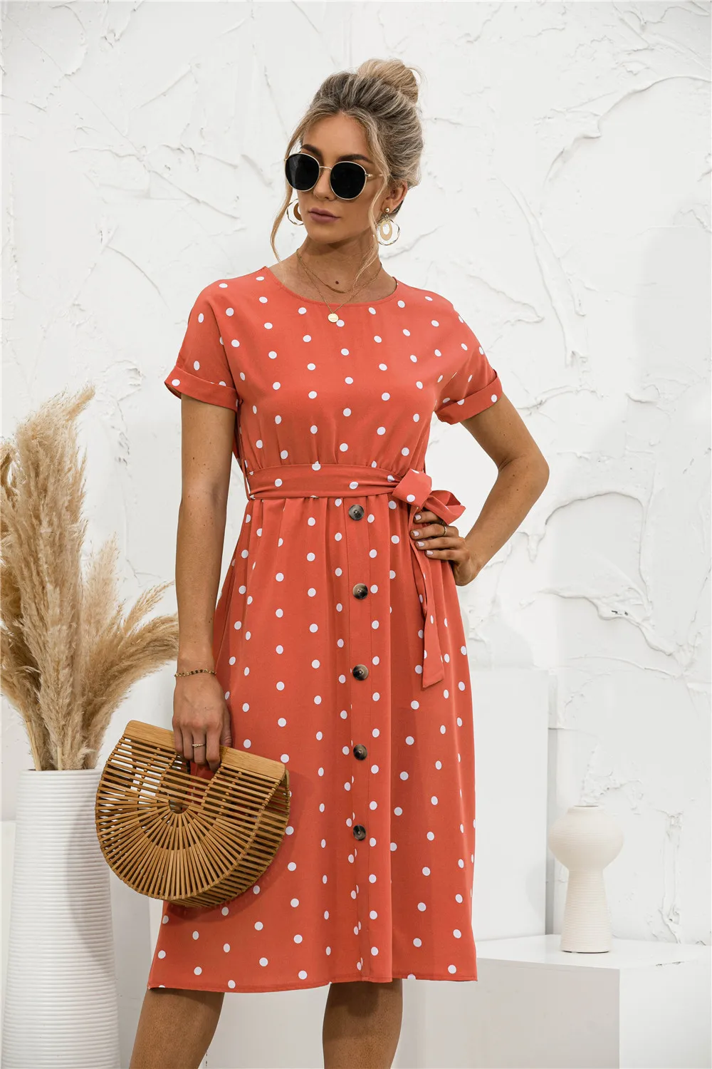 Home>Women's Dresses>Vacation Dresses>Women Summer Beach Chiffon Dress Casual Short Sleeve Polka Dot Dress Midi Dress Femme Vestidos Elegant O Neck Sundress With Belt
