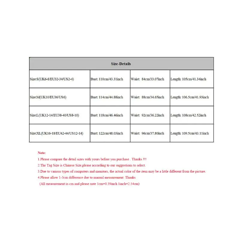 Size:XL(UK16-18/EU42-44/US12-14)---Bust: 122cm/48.03inch---Waist: 96cm/37.80inch---Length: 109.5cm/43.11inch