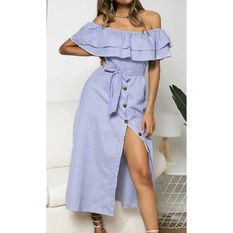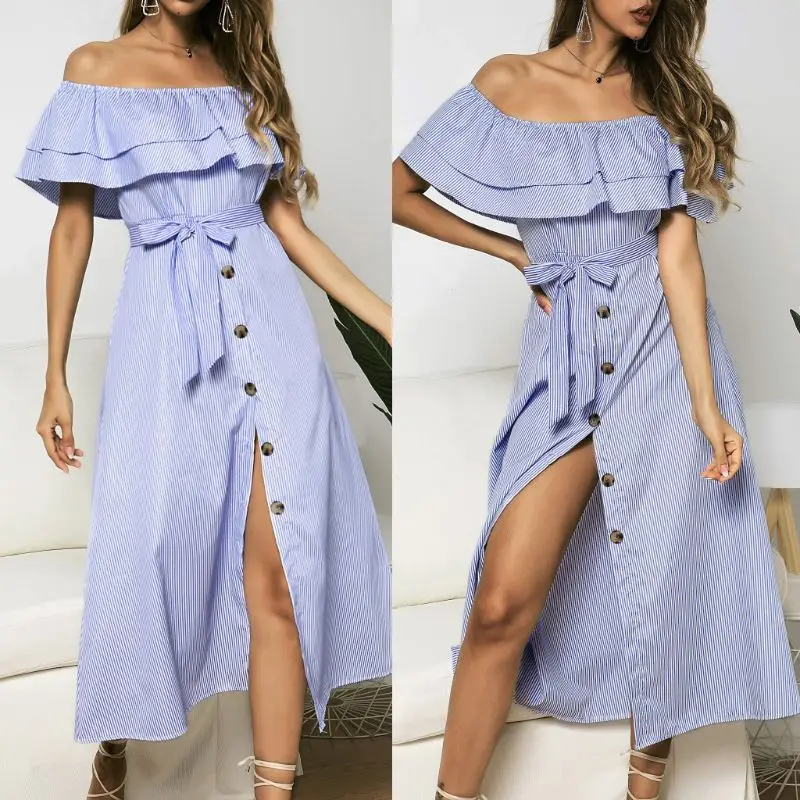 - Product Name: Women Summer Beach Off Shoulder Striped Ruffle Button BOHO Midi Dress S / M / L / XL