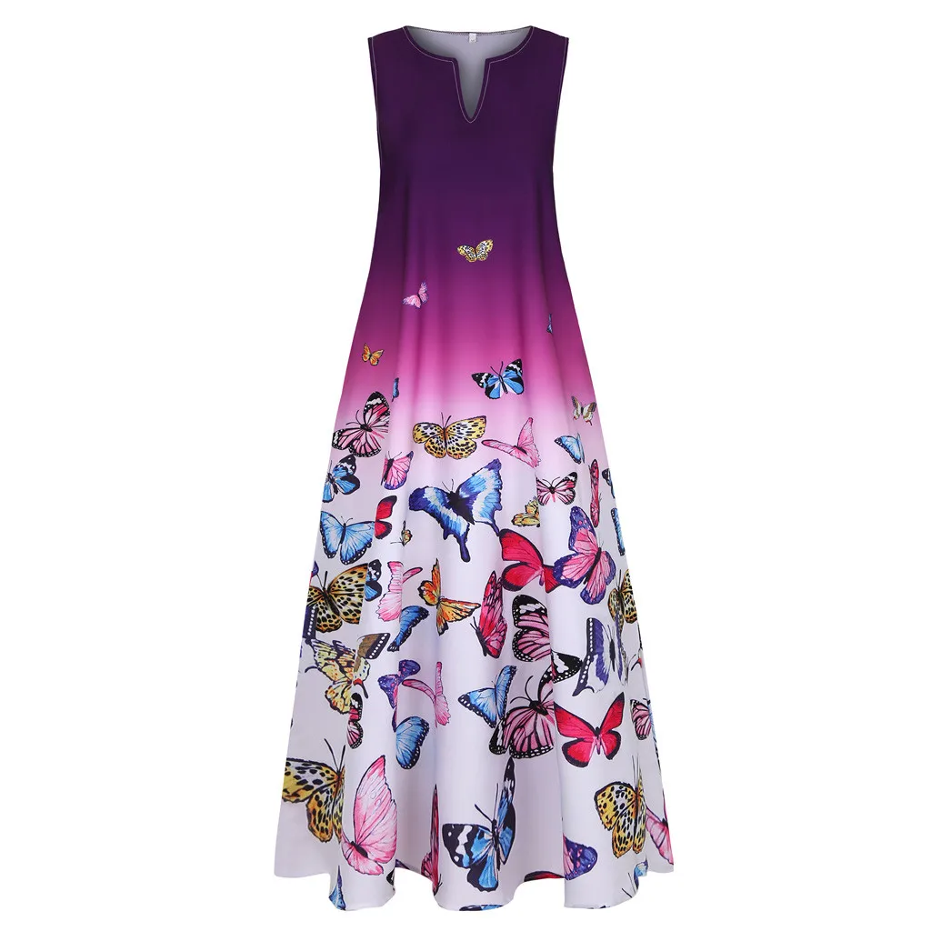 - Product Name: Women Summer Dress Ladies Fashion Plus Size Butterfly Print Daily Sleeveless Vintage Bohemia V Neck Maxi Dress Sundress