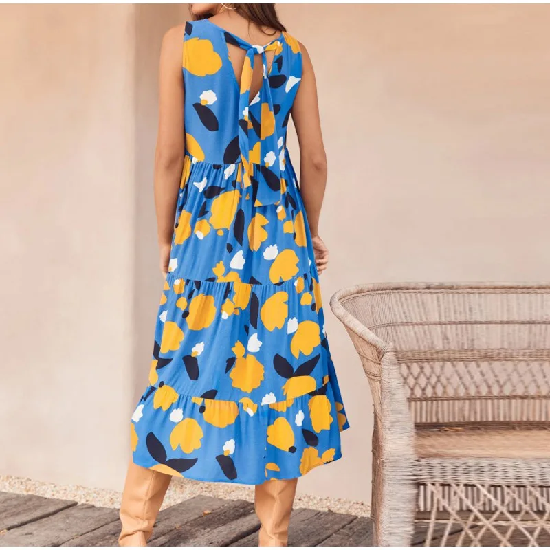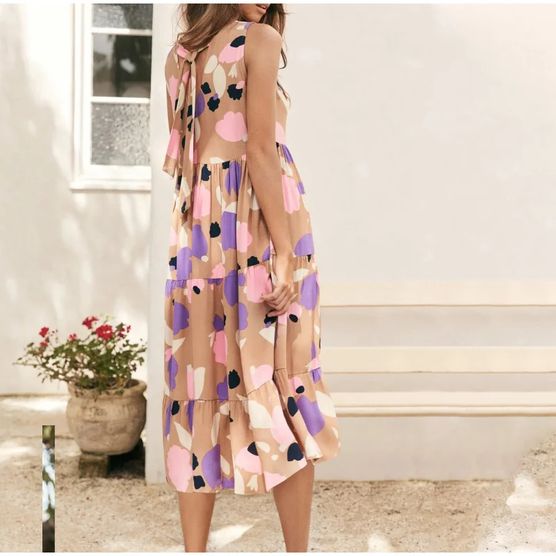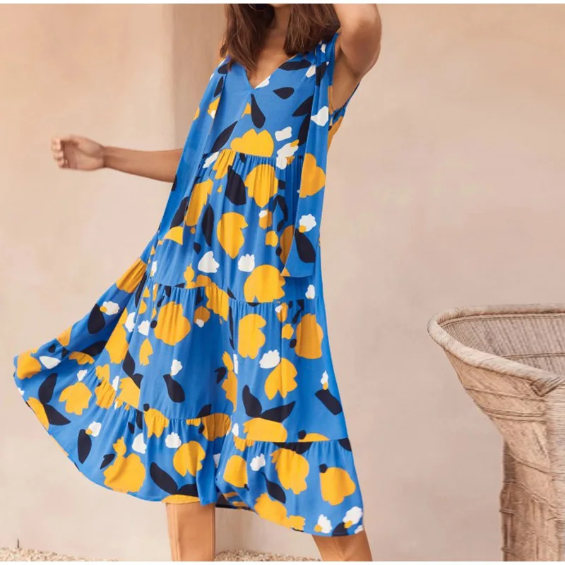 Women V-neck Sleeveless Print Midi Dresses Casual Female Fahion Pleated Dress 2021 Summer Ladies Vacation Beach Vestidos
