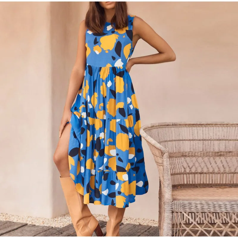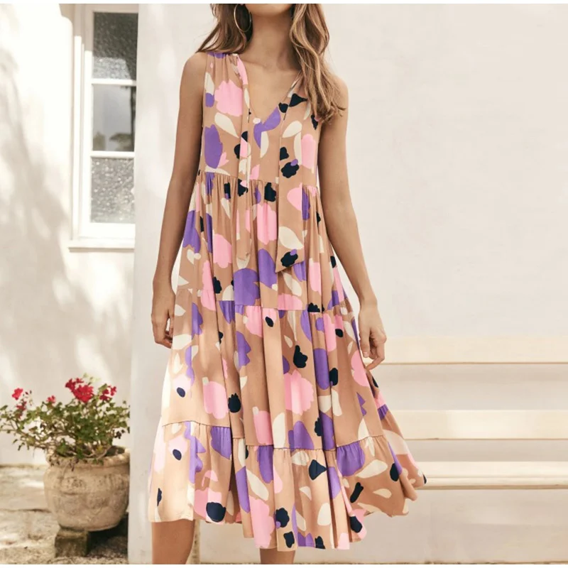 - Product Name: Women V-neck Sleeveless Print Midi Dresses Casual Female Fahion Pleated Dress 2021 Summer Ladies Vacation Beach Vestidos