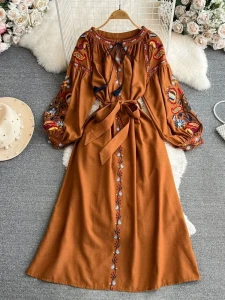 - Product Name: Women Vintage Ethnic Lantern Long Sleeve Embroidered Round Neck Slim A-line Cotton Linen Dress