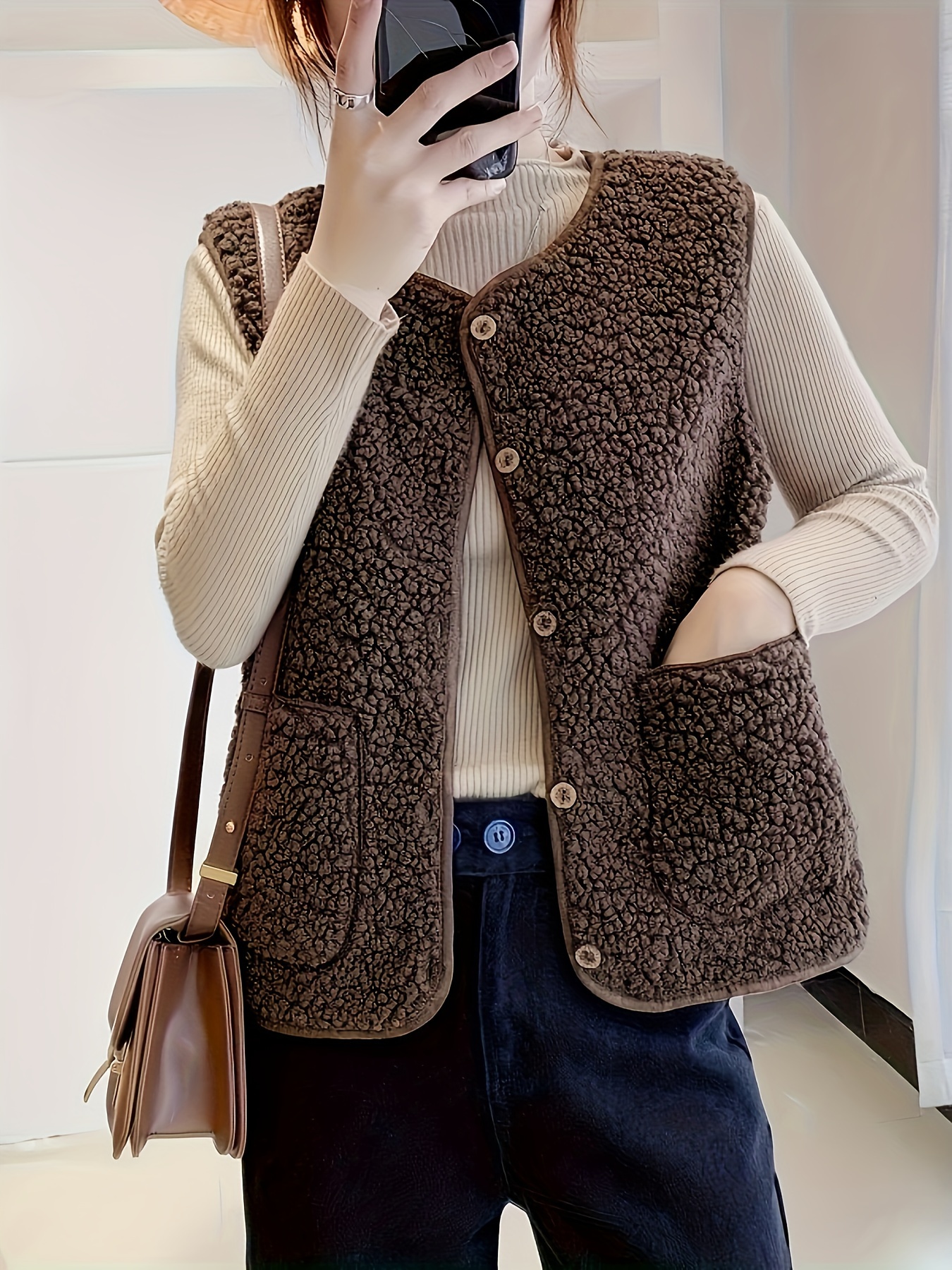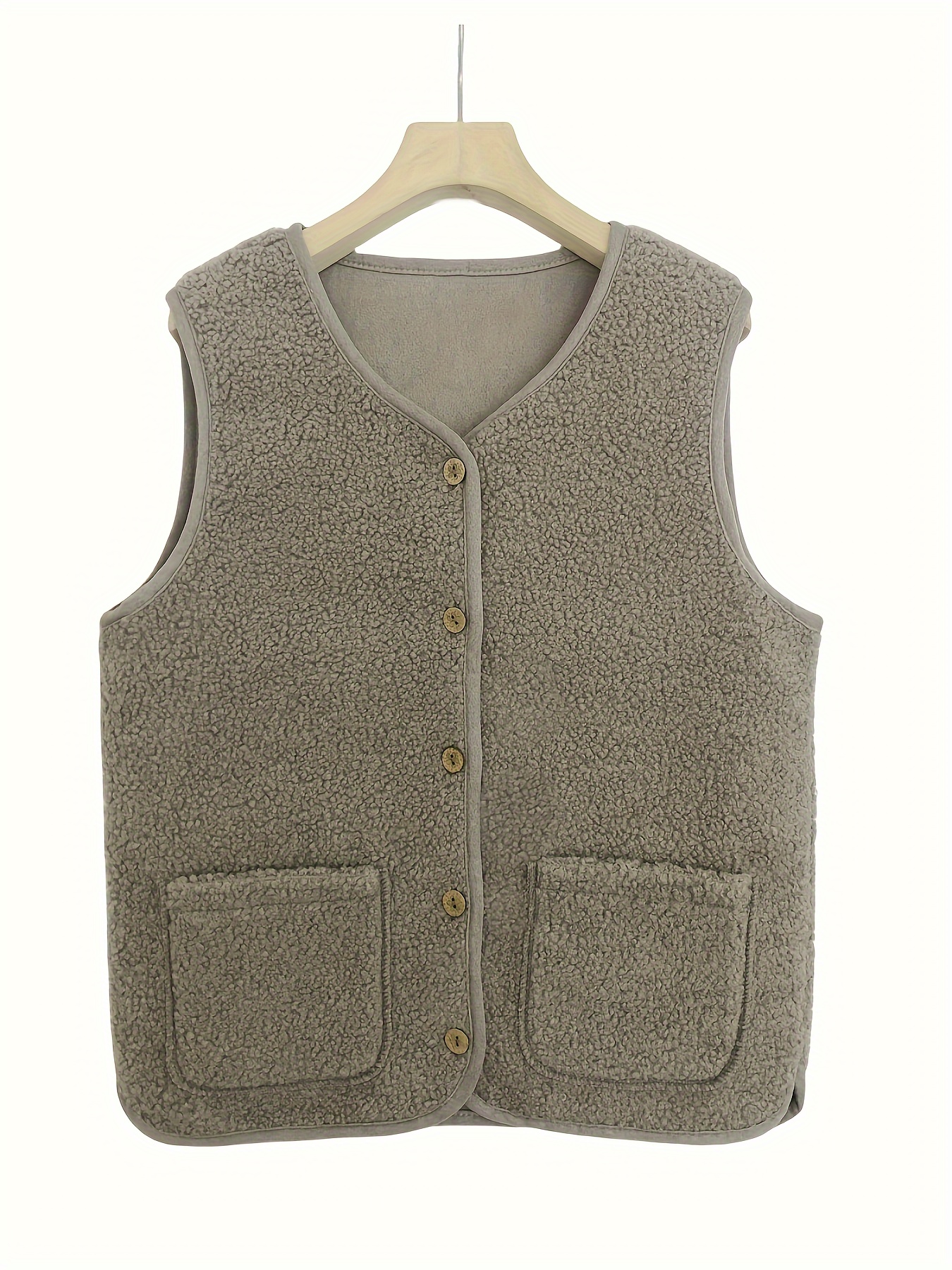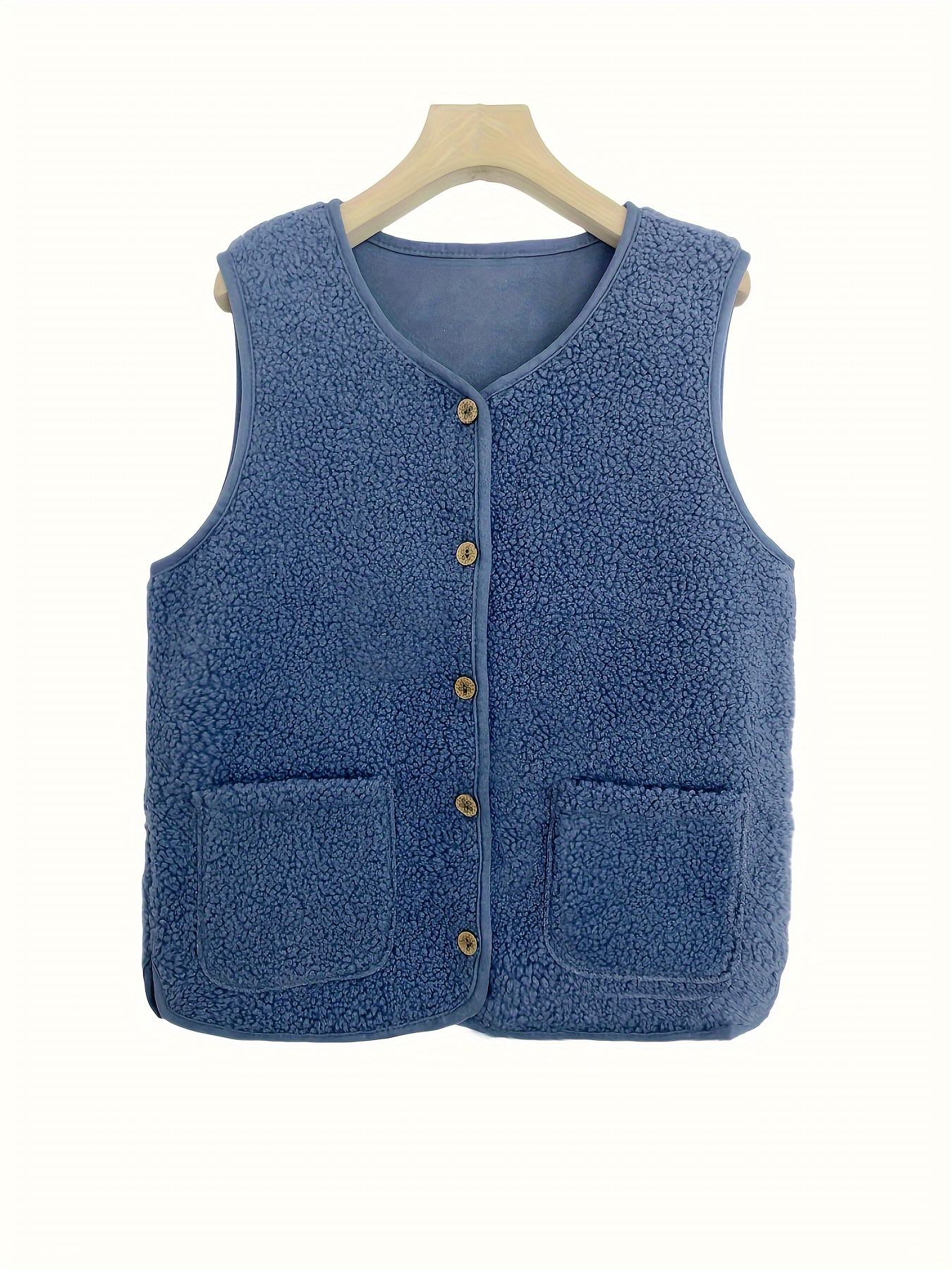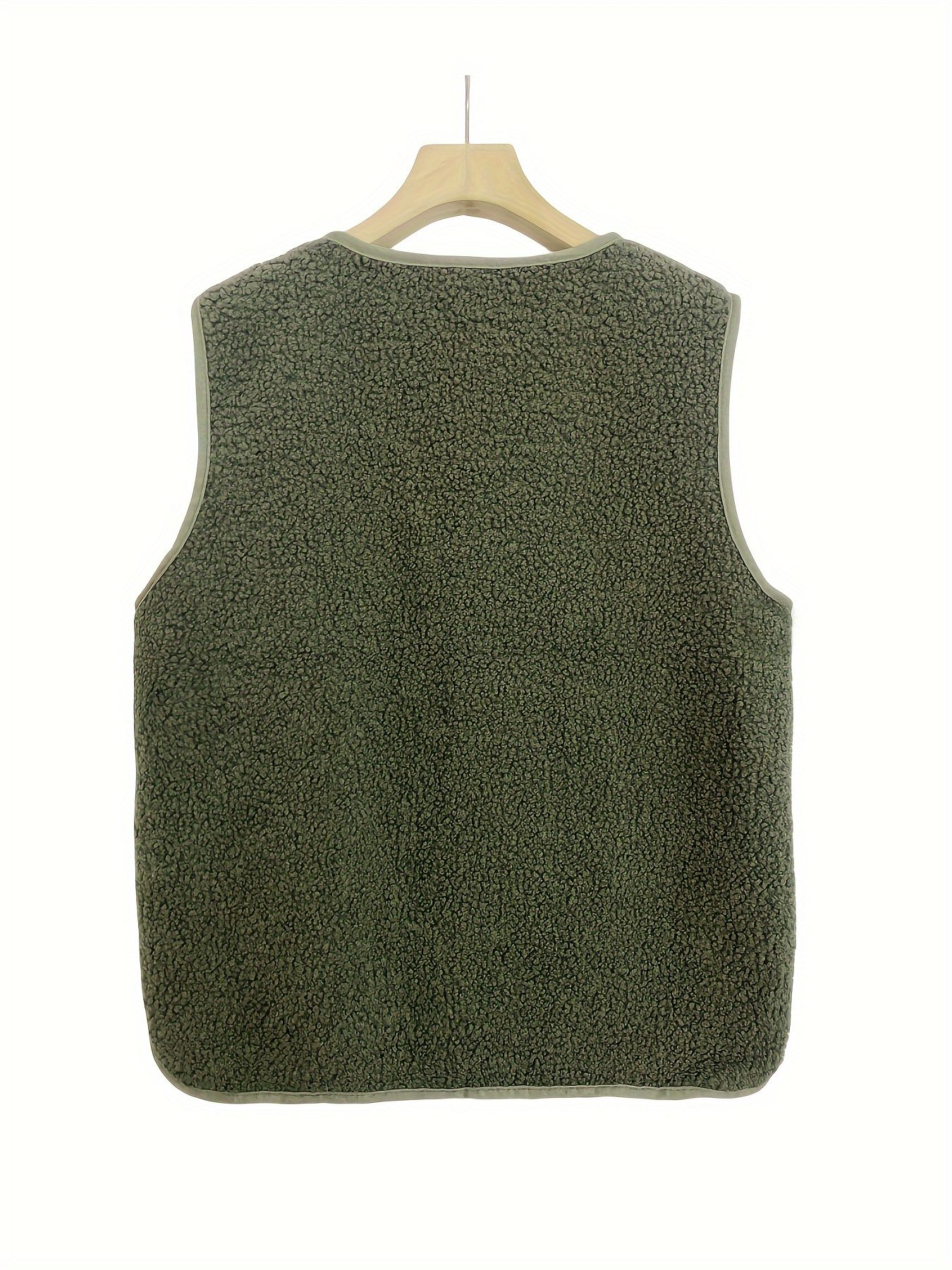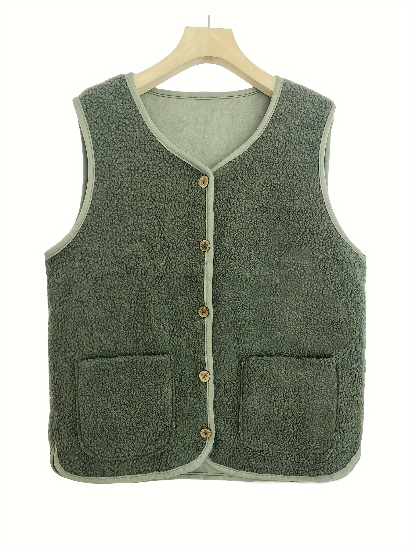 Women's Cozy Fleece Vest - Green Sleeveless Plush Jacket with Button Front & Pockets, Casual Winter Outerwear for Adults, Sweater Vest